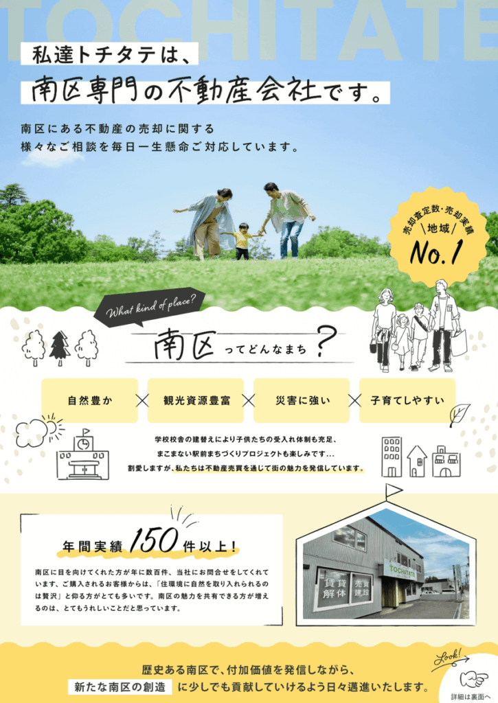 私達は、不動産の売買を通じて、南区を維持・活性化させることが使命だと思っております。だからこそ、1度でも関わった方には、不動産売買において損をしていただきたくない、トチタテを知ったからには少しでも得をしていただきたい、そんなサービスを心掛けています。