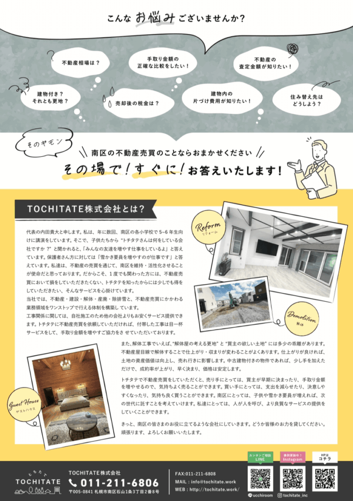 トチタテで不動産売買をしていただくと、売り手にとっては、買主が早期に決まったり、手取り金額 を増やせるので、気持ちよく売ることができます。買い手にとっては、支出を減らせたり、決意しやすくなったり、気持ち良く買うことができます。南区にとっては、子供や雪かき要員が増えれば、次の世代に託すことを考えていけます。 私達にとっては、人が人を呼び、より良質なサービスの提供をしていくことができます。